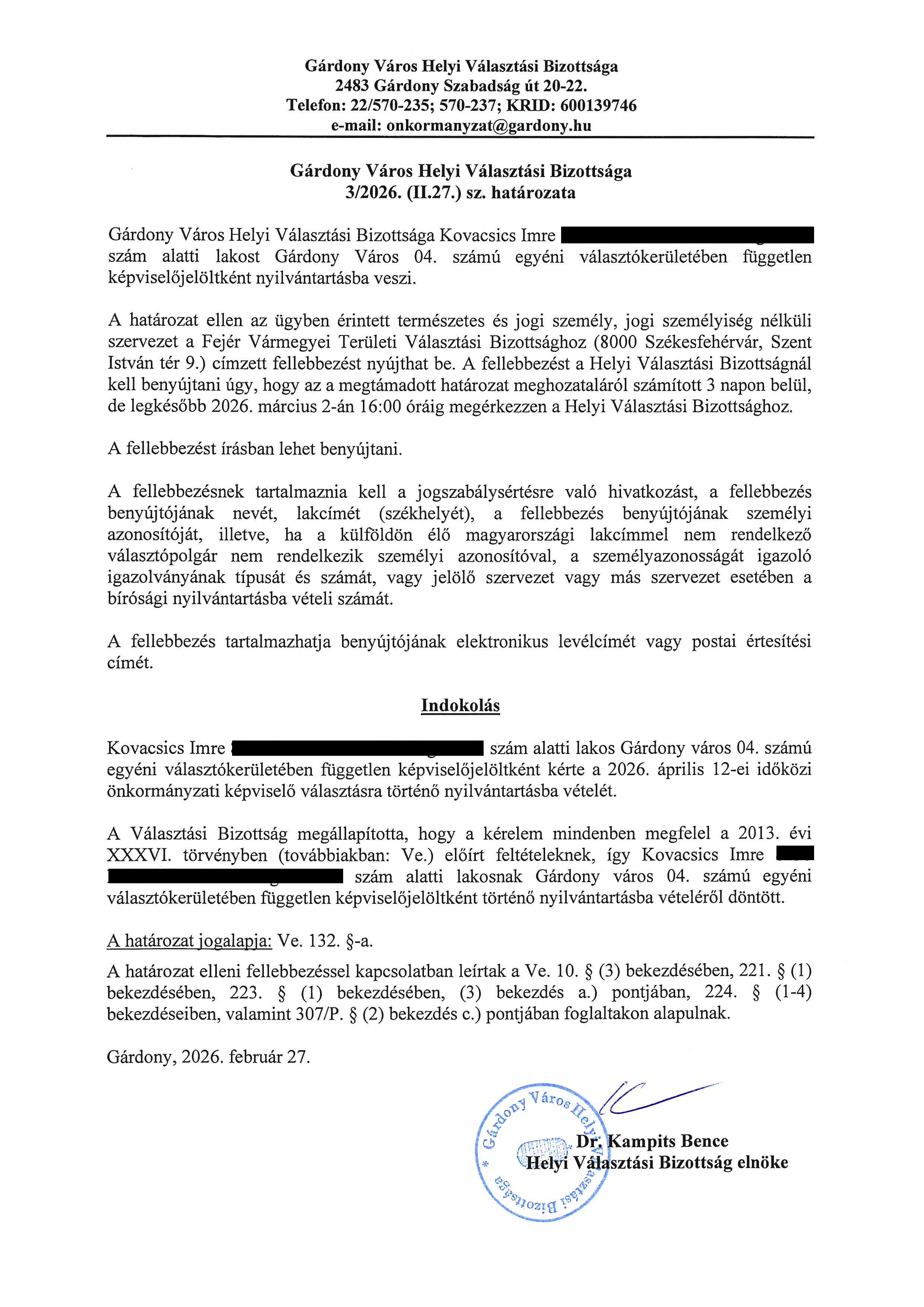 3/2026. (II.27.) számú határozat - jelölt nyilvántartásba vétele